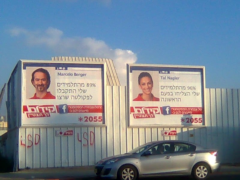 כל מי שנכנס לעיר ראשון לציון, עיר הולדתה של הפטריה, מרצונו או כי הכריחו אותו, לא יכול שלא להיתקל בסדרת שלטי הפרסומת. במקרים רבים נתקלים בשני מוצרים מתחרים המפרסמים באותו שטח פרסום בדיוק, האחד מול השני. הפעם, לקראת מועד הפסיכומטרי הפופולארי ביותר המכונה גם "מועד אפריל", דו קרב בין 2 בתי הספר הגדולים בארץ לפסיכומטרי, "קידום" ו"יואל גבע". לאורך השנים, ניתן להבדיל בין 2 החברות האלה, גם דרך שיטת הפרסום שלהם. בקידום, תמיד תהיה סיסמא מנצחת כלשהי. נסיון למכור את הקורס, לומר שהוא הטוב ביותר. "לך תצטיין" הייתה הסיסמא שליוותה את רוב הקמפיינים הקודמים של קידום, אבל ב 2-3 הקמפיינים האחרונים, השתחררו שם מעט מהסיסמא עתיקת היומין, לטובת הקידמה. הפעם, בחרו בקידום במודעה דמוית פרופיל פייסבוק, עם תמונות מורי בית הספר המבשרים על אחוזי ההצלחה של התלמידים שלהם להתקבל ללימודים, אחוזי קבלת ציונים גבוהים ועוד. כרגיל, מדובר בסטטיסטיקה שאף אחד מכם לא באמת יכול לבדיוק בעצמו. לכן אני מוצא את הפרסום הזה כמזלזל מעט באינטיליגנציה הבסיסית שלנו.