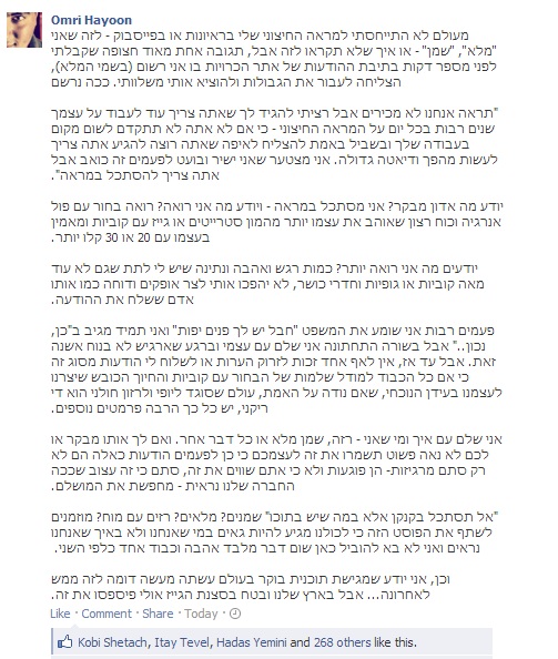 כשמגישת החדשות האמריקאית התייחסה לטענות הצופה שכינה אותה שמנה בשידור חיי, היה זה מהלך מפתיע ומרגש, שבדרך כלל לא רואים כמוהו ולכן זכה לפופולאריות גדולה ושיתופים רבים ברשת. המהלך של עמרי מרגיש מעט ממוחזר, איני יכול להעמיד עצמי בנעליו של חיון ואני מניח שכפי שאמר, סבל הרבה בחייו מהעלבות כאלה ואחרות בעניין המשקל, אך כאמור, אם כל אחד מידועני ארצנו שנפגע מחשיפה כזו או אחרת של עמרי חיון היה מפרסם סטטוס בנושא, עמרי חיון היה צריך לרדת למחתרת. קליק לסטטוס של חיון. מוזמנים להגיב ולהביע דעתכם.