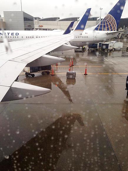 רואים את הטיפות על הזכוכית והמסלול הרטוב? זה גשם זלעפות. והכלוב שם באמצע התמונה? זה כלב נטוש שהמתין לבד בין מטוסים על המסלול בשדה התעופה של יוסטון, רטוב כולו ובלי יכולות לברוח למקום יבש, כי כלוב וזה. וככה זה נמשך חצי שעה לפחות.