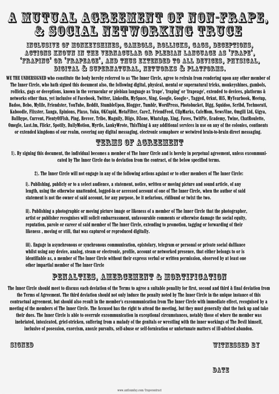 בלוגר בשם מרטין קלי, החליט שנמאס לו מהתופעה המגונה (והמאוד מאוד מצחיקה הזאת), וכתב מסמך חצי משפטי, מעין אמנה עליהם אמורים לחתום הצדדים (אתם והחברים לצורך העניןי), ולפיה החתומים מתחייבים לא לפרסם סטטוסים בשמו של חבר שלהם, לא לבצע מתיחות פייסבוק מטופשות, או פגיעה בשמו הטוב של חבר, תופעה המכונה בסלנג האמריקאי-גיקי Frape (שילוב של המילים אונס ופייסבוק – אונס פייסבוק).