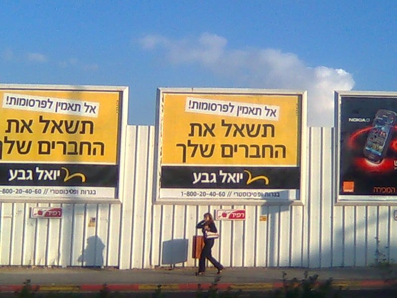 כל מי שנכנס לעיר ראשון לציון, עיר הולדתה של הפטריה, מרצונו או כי הכריחו אותו, לא יכול שלא להיתקל בסדרת שלטי הפרסומת. במקרים רבים נתקלים בשני מוצרים מתחרים המפרסמים באותו שטח פרסום בדיוק, האחד מול השני. הפעם, לקראת מועד הפסיכומטרי הפופולארי ביותר המכונה גם "מועד אפריל", דו קרב בין 2 בתי הספר הגדולים בארץ לפסיכומטרי, "קידום" ו"יואל גבע". לאורך השנים, ניתן להבדיל בין 2 החברות האלה, גם דרך שיטת הפרסום שלהם. בקידום, תמיד תהיה סיסמא מנצחת כלשהי. נסיון למכור את הקורס, לומר שהוא הטוב ביותר. "לך תצטיין" הייתה הסיסמא שליוותה את רוב הקמפיינים הקודמים של קידום, אבל ב 2-3 הקמפיינים האחרונים, השתחררו שם מעט מהסיסמא עתיקת היומין, לטובת הקידמה. הפעם, בחרו בקידום במודעה דמוית פרופיל פייסבוק, עם תמונות מורי בית הספר המבשרים על אחוזי ההצלחה של התלמידים שלהם להתקבל ללימודים, אחוזי קבלת ציונים גבוהים ועוד. כרגיל, מדובר בסטטיסטיקה שאף אחד מכם לא באמת יכול לבדיוק בעצמו. לכן אני מוצא את הפרסום הזה כמזלזל מעט באינטיליגנציה הבסיסית שלנו.