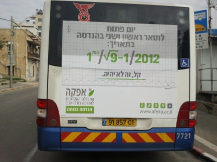 מכללת אפקה השיקה לפני מספר ימים קמפיין חביב ביותר תחת הסלוגן "קל זה לא יהיה" לקראת היום הפתוח שהיא מקיימת בתאריך אותו יש לפענח מהתרגיל המתמטי המורכב המופיע במודעה ובפרסומת. לאלה מכם שמתמטיקה היא לא הצד החזק שלהם – התאריך הוא 1.2. מעבר לקמפיין שלטי החוצות והאוטובוסים (תמונה מתוך מזבלה) יש גם פרסומת טלויזיה חביבה, ואם חשבתם שהתרגיל על גבי המודעה בגב האוטובוס הוא קשה, חכו שתנסו לפענח את מספר הטלפון של אפקה המופיע בסוף הפרסומת. אין ספק שנעשתה כאן עבודת קריאייטיב מגניבה ויצירתית, והקישור בין הסלוגן לפרסומות עצמן הוא מגניב ביותר. בסופו של דבר, מי שהיום הפתוח הזה באמת חשוב לו, ומתכנן ללמוד הנדסה, יעריך מאוד את הקמפיןי הזה. שאר האנשים גם ככה לא רלוונטים עבור אפקה. יופי של עבודה. קליק למיניסייט של אפקה, בו תוכלו להירשם ולקבוע לעצמכם מערכת שעות ליום הפתוח באמצעות ממשק וירטואלי חביב.