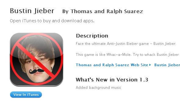 ילד חביב בן 10, שם לב למגמה בולטת בבית הספר שלו – שנאה כלפי ג'סטין ביבר. במחשבה שיווקית גאונית, החליט הילד, תומאס סוארז שמו, לפתח אפליקציית אייפון בה ניתן להכות את ג'סטין ביבר. הרעיון נשמע אלים יותר ממה שהוא בפועל. באפליקצייה, הנקראת "bustin jibber", הפרצוף של ביבר מופיע על המסך ומחליף מיקום כל חמישית שניה. השחקן מתבקש לנסות להכות את פרצופו לפני שנעלם. המשחק מיועד לשחקן בודד, או שני שחקנים וניתן אפילו לשחק בו ברשת מול שחקנים אחרים, תוך כדי צ'אט קולי. ואת כל זה עשה ילד בן 10. מיותר לציין כי זו לא האפליקציה הראשונה שהוא מפתח.