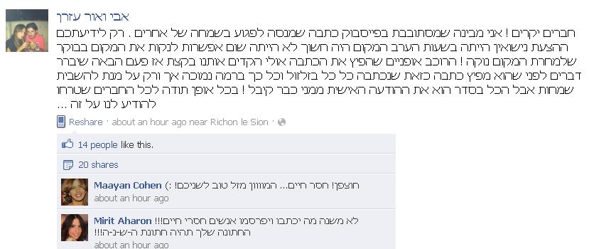 מטרתו של ייבגני ושאר המשתפים כמובן, היא לגלות מי הוא הזוג שגרם לבלאגן ולהעמיד אותם על טעותם. על פניו, מטרה טובה. עכשיו היו אמיתיים לרגע עם עצמכם. נכון, סביר להניח שאם אתם אנשים עם דרך ארץ בסיסית, אתם תנקו אחריכם. אולם המציאות היא לא כזאת, וכולנו ממש לא טלית שכולה תכלת. כולנו זרקנו מתישהו משהו על הרצפה, או התעצלנו להרים נייר או שקית שנפלו והחלו לעוף. כולנו נתקלנו בהמוני ישארלים שמשאירים אחריהם פארקים מזובלים, או בילדים שזורקים ניר של ארטיק על הרצפה כי ככה ההורים אומרים להם. אז אולי אף אחד מאיתנו לא מזבל בכמות כזאת, ואולי זריקת בדל סיגריה על הרצפה היא פחות חמורה מכמות הזבל שהשאיר אחריו הזוג המאושר, אך האם זו סיבה מספיק טובה לבצע בשניים לינץ' פייסבוקי? האם זה מה שיחנך את העם? כשייחשף הזוג, ישראל תהפוך למדינה נקייה?