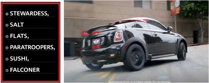 חברת מיני, המשווקת את מכונית המיני קופר הכל כך מגניבה ומרגשת, החליטה להשיק את הדגם החדש של הרכב בדרך מקורית ביותר. בתחילה, עלו שם בקמפיין פייסבוק אשר קרא לגולשים לכתוב מה הוא מבחן הנהיגה המושלם שלהם עבור המיני קופר החדשה, ב- 6 מילים בלבד. אלפי גולשים השתתפו בתחרות, אך רק זוכה מאושר אחד, מתיו פוסטר, קיבל את המובטח לו – מימוש של מבחן הנהיגה המושלם שלו באמצעות סרטון פרסומת. ואלו ששת המילים שהוא בחר עבור מבחן הנהיגה המושלם: