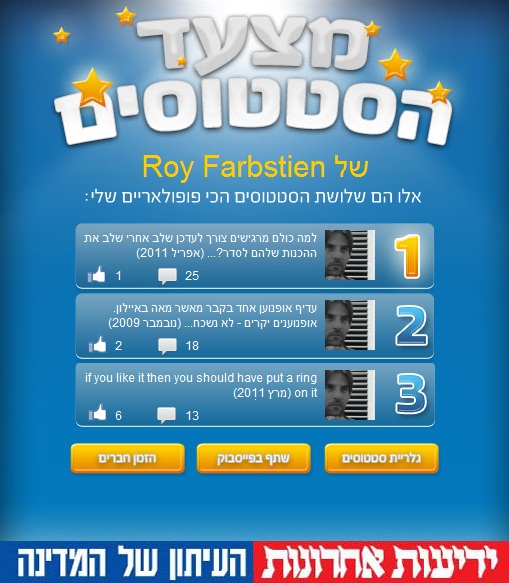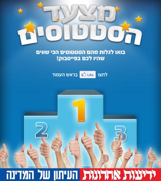 כעת, כמה מפתיע, יוצאים בעיתון "ידיעות אחרונות" המתחרה הגדול של ישראל היום בקמפיין פייסבוק חדש בעמוד הפייסבוק שלהם, בו הם מזמינים אתכם הגולשים לבדוק מה שלושת הסטטוסים הכי שווים שלכם על פי לייקים ותגובות. נשמע כמו חיקוי ועוד ירייה במלחמה בין שני העיתונים השולטים במדינה, אבל לנו לא איכפת, אנחנו אוהבים את זה. סקרנים? כנסו לאפליקציה ותגלו מה האפליקציה העלתה בחכתה בנוגע לסטטוסים שלכם.