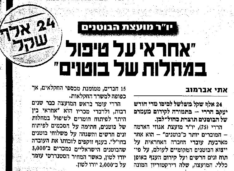 השנה, המנצח בתחרות בקטגוריית המשרות-ההזויות-המעניקות-לבעליהן-ים-כסף הוא יעקב הררי, אשר ממלא את התפקיד החשוב – יו"ר מועצת הבוטנים. כן רבותיי, יש תפקיד כזה, ואם ממש תתאמצו אולי תוכלו גם אתם להיות יום אחד יו"ר מועצה של פיצוח פופולארי כלשהו. יו,ר מועצת הקשיו, יו"ר מועצת גרעיני האבטיח וכו'. לקרוא ולא להאמין.