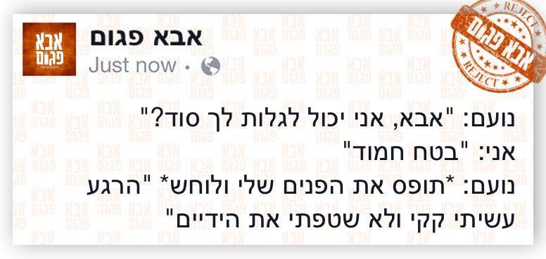 עמוד הפייסבוק הנהדר אבא פגום נוצר למען אותם אבות בדיוק, אלה שמנסים בכל כוחם להיות טובים בטיפול בילדים אבל איכשהו בסוף הכל תמיד מתפקשש להם והולך הפוך. בעמוד שנוצר לפני כשנתיים על ידי סהר בן הרוש, אב פגום לילדה בעצמו, מתפרסמים בכל יום תמונות וסטטוסים קורעים של הורים מיואשים, גברים ונשים, שמשתפים את הגולשים בתלאות הפרטיות שלהם בכל הנוגע לגידול הילדים. מיותר לציין שהתמונות זוכות לפופולריות רבה וקשה למצוא אבא טרי שלא מקבל המלצה חמה לעקוב אחרי אבא פגום.