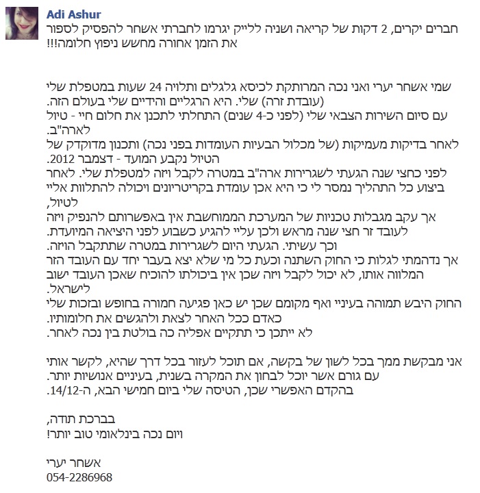 בסטטוס שפורסם אמש בפייסבוק על ידי חברתה של אשחר עדי אשור, מפרסמת עדי מכתב נוגע ללב שכתבה אשחר, אותו היא מפנה לכל מי שיכול לעזור. במכתב מספרת אשחר על כך שתחילה התבשרה כי היא והמטפלת עומדות בכל הקריטריונים, ך בד בבד נאמר לה כי עקב היותה עובדת זרה, תוכל המטפלת לקבל ויזה רק מספר ימים לפני הטיול. לפני מספר ימים, כשבועיים לפני הטיסה, פנתה שוב אשחר לשגרירות, אך הפעם התשובה הייתה מעט שונה.