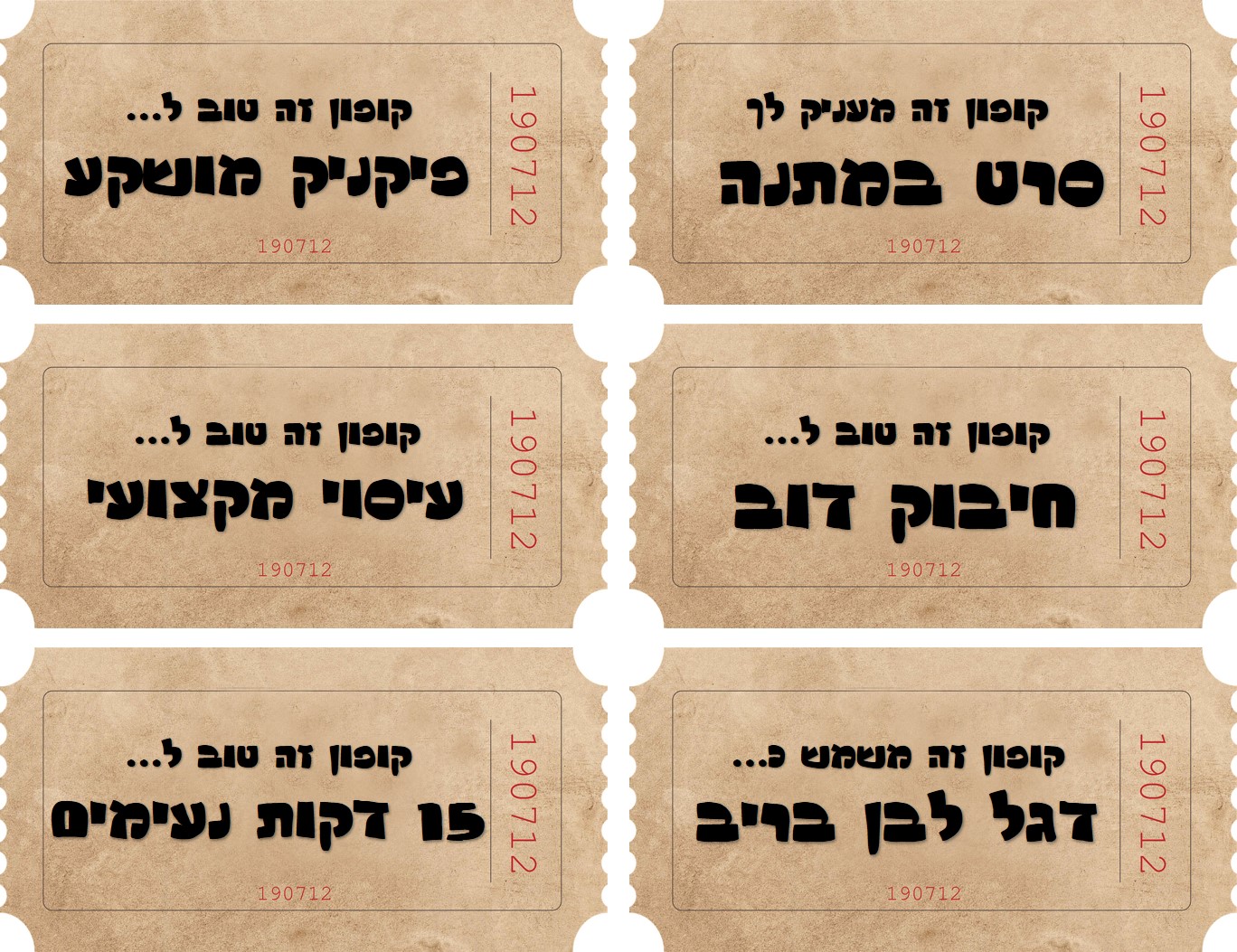 אין אחד שלא אוהב לקבל קופונים! אם נגיד לכם שאתם יכולים להכין במתנה פנקס קופונים המותאמים אישית למקבל/ת המתנה? אתם יכולים לעצב במחשב או בכתב יד, מבחר קופונים שלדעתכם יתאימו לחוגג/ת יום ההולדת.