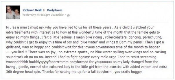 גולש אמריקאי בשם ריצ'ארד ניל, פרסם לפני כשבוע סטטוס משעשע על קיר הפייסבוק של חברת מוצרי ההיגיינה BodyForm, בו שפך את טענותיו ועורר מחדש את הדיון על חוסר האמת בפרסום בכל הנוגע למחזור החודשי הנשי. וכך כתב ניל: