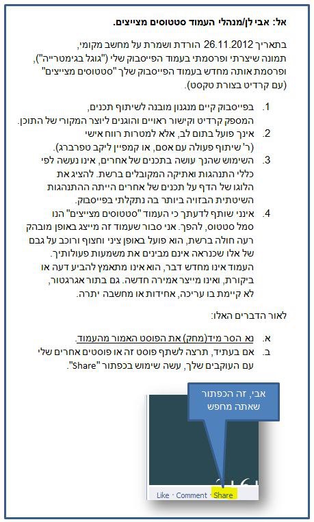 "מהרגע הראשון שבו הוקם דף סטטוסים מצייצים, הבהרנו וכיבדנו כל מי שביקש לא לפרסם, או להסיר תכנים שלו מהדף. אנחנו מלקטים פוסטים מרחבי הרשת, מעלים אותם תחת שם הדף, ומעניקים קרדיט למי שכתב/יצר אותם. בנוסף, אנחנו מעניקים אפשרות לפוסט שלך להגיע למאות אלפי אנשים. זו התמורה שאנחנו יכולים להציע. לא מוצאת חן בעיניך השיטה? – זכותך המלאה! ובמלוא הכבוד הראוי."