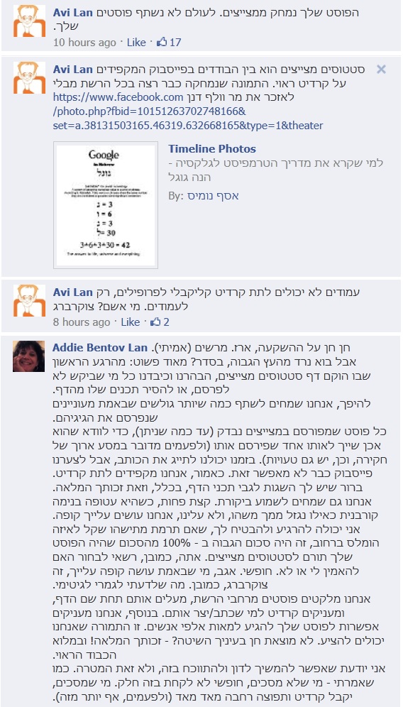 מצד אחד, אפשר להבין את וולף וטענותיו. למרות תגובתו של לן, בהחלט ניתן לשלב קרדיט קליקבילי ליוצר, לפחות כשמדובר בתמונה. מתוך ניהול העמוד העניין לא מתאפשר, אבל לאחר הפרסום ניתן לערוך את התמונה, מתוך פרופיל מנהל העמוד ואז לשלב את הקישור הקליקבילי. קצת יותר עבודה, אבל עושה צדק עם היוצר. מעבר לכך, אנשים ששמם אינו ייחודי כמו "משה כהן" למשל, ומקבלים קרדיט לא קליקבילי, סביר שאיש לעולם לא יוכל לאתר אותם, כך שהיוצר לא באמת נהנה מה'חשיפה'. בנוסף, כפי שכותב וולף, ניתן להשתמש בכפתור share ולשתף את התמונה המקורית במקום להעלותה מחדש. ראוי לציין כי מרבית העמודים הגדולים לא נוהגים גם הם לעשות זאת, ומשתמשים באופציית הקרדיט.