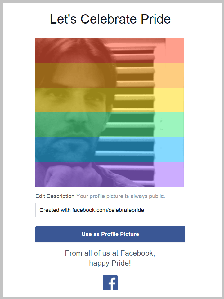 כדי לצבוע את תמונת הפרופיל שלכם ולהשתתף בחגיגה הגדולה של הקהילה הגאה, כל שעליכם לעשות הוא ללחוץ כאן, ולאשר את תמונת הפרופיל החדשה שלכם, שתופיע באופן אוטומטי בעמוד המיוחד שיצרה פייסבוק. בנוסף, תוכלו לכתוב סטטוס שיצטרף לעדכון שיופיע על הפיד שלכם וייבשר לעולם על השינוי בתמונת הפרופיל שלכם.