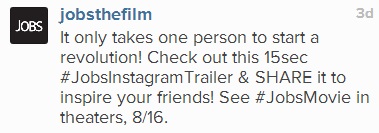הסרט החדש "ג'ובס" בכיכובו של אשטון קוצ'ר, שחקן מפורסם וסוג של אושיית רשת בעצמו, מציג: טריילר ראשון לסרט באמצעות הווידאו של אינסטגרם, שהעלה על ידי פרופיל האינסטגרם הרשמי של הסרט, jobsthefilm.