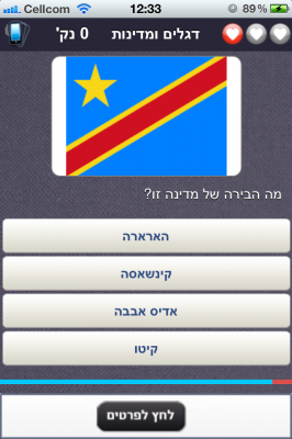 ולקינוח… אפליקציה אחת ישראלית. האפליקציה שואלת שאלות טריוויה לגבי מדינות (להתאים מדינה לדגל, "מהי הבירה של.." ועוד) ומתאימה למי שאוהב להחכים בזמנו החופשי, לגאונים לא מרושעים, ולמי שאוהב מונופול ומתכנן להשתלט על העולם לפני גיל 21.