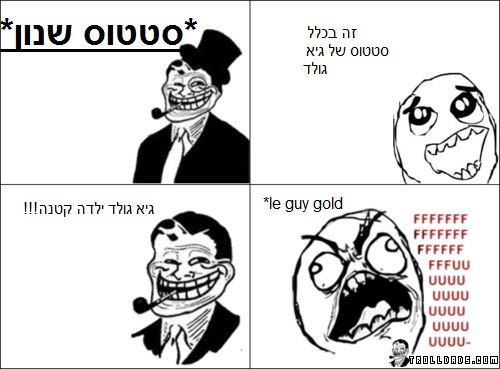 אחד הגולשים שסובלים באופן קבוע מהתופעה הוא גיא גולד, המוכר לרובכם בזכות מגוון הסטטוסים המצחיקים, החריפים והשנונים שלו. אתמול, בפעם המי יודע כמה פרסם גולד סטטוס חריף נוסף בענייני גניבות סטטוסים לאחר זמן רב בו לא התבטא בנושא. בסטטוס שפרסם הכריז גולד על פינה חדשה בפרופיל הפייסבוק שלו, פינת "אתה בושה" המשעשעת, במסגרתה יפרסם על הבמה הראשית של הפיד שלו צילומי מסך של סטטוסים גנובים שלו, יחד עם שם ותמונת הגולש המעתיק.