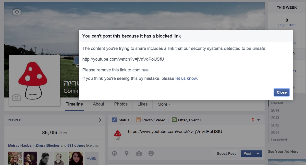 בשעות האחרונות, באופן מסתורי, נעלמו לפתע קישורי היוטיוב המובילים אל הסרטון מקירות פרופילי הפייסבוק של כל הגולשים ששיתפו אותו, כולל מהעמוד של גדי וילצ'רסקי עצמו. ניסיון לשתף שוב את הקישור לסרטון מוביל להודעת שגיאה של פייסבוק, המבשרת כי הקישור נחסם היות וזוהה כמסוכן על ידי מערכות האבטחה של פייסבוק.