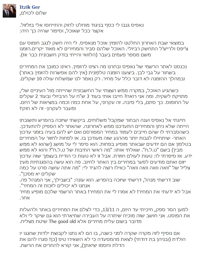 איציק ורייצ'ל, זוג נחמד מאזור המרכז, חשו רעבים במוצאי השבת האחרונה, והחליטו להזמין אוכל ממסעדת נאפיס חולון, הידועה במנות האוכל היחסית זולות שלה. בסטטוס שהעלה איציק לפרופיל הפייסבוק שלו, הוא מגולל סיפור מאוד מרגיז ומקומם, שגם אם לא נכנס לקטגוריית השערוריות הגדולות בתולדות המדינה, צריך להדליק לכולנו נורה אדומה, ולגרום לנו לשים לב היטב לחשבון אותו אנו משלמים.