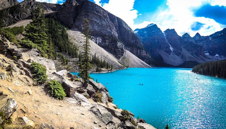 עשו תצפית על מימיו השקופים כקריסטל של אגם מוריין בהרי קנדה