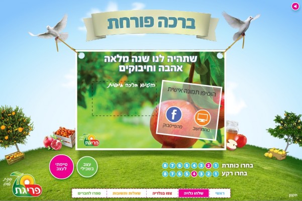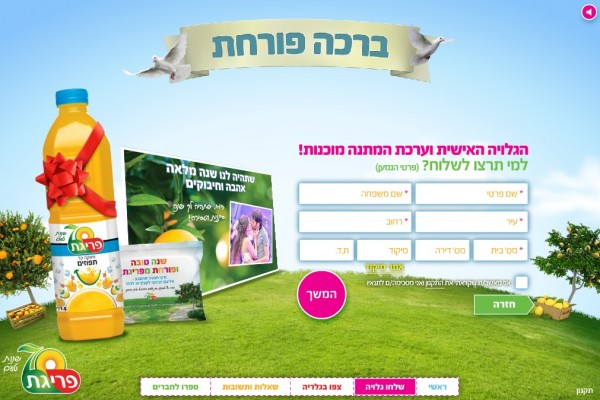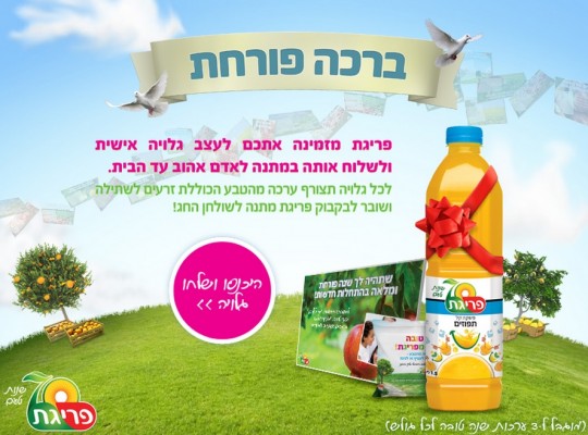 ביצרנית המשקאות פריגת יצאו בפעילות מקסימה וכיפית לרגל ראש השנה. במסגרת הפעילות נבנתה אפליקציה חמודה בעמוד הפייסבוק של פריגת, המאפשרת לכם הגולשים ליצור בכרת שנה טובה עבור הקרובים לכם ולעצב אותה בהתאמה אישית. גלוית השנה הטובה שיצרתם תישלח בדואר על ידי החברים בפריגת לכתובת אותה הזנתם, בצירוף שקית זרעים לשתילה, וגם שובר לבקבוק פריגת במתנה.