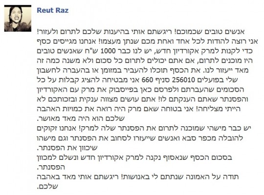 הפוסט של רעות זכה למעל 300 שיתופים עד כה, ולתגובות מצד הגולשים שביקשו לעזור ולתרום. רעות מספרת לאתר הפטריה: "ההענות מדהימה! אנשים תורמים כסף ואספנו כמעט 2000 ש"ח. אנשים תרמו פסנתר, אנשים מוכנים לבוא לעזור בסחיבת הפסנתר, ויש לנו 2 מכווני פסנתרים שמוכנים לבוא לכוון את הפסנתר כתרומה! אנשים הציעו לנקות לו את הבית ולהביא לו אוכל! אני פשוט בהלם מכמויות הטוב שאנשים הציעו!"