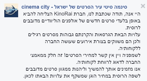 אם אתם דוברי רוסית ואתם רוצים לראות סרט בדיבוב לרוסית באחד מבתי הקולנוע של רשת "סינמה סיטי" תאלצו לשלם מחיר גבוה במיוחד על חווית הקולנוע שלכם. הסיבות לאי השיוויון הזה והתגובה של הסינמה סיטי בהמשך כתבה.