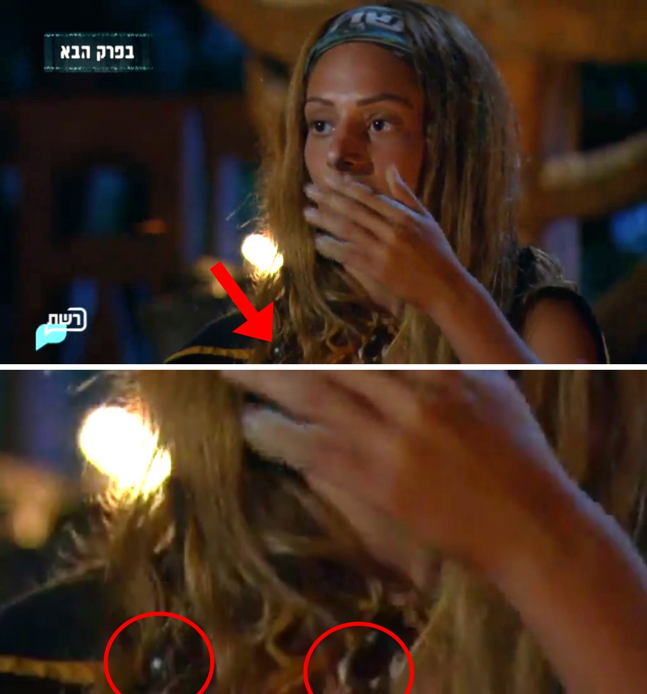 בפריים בו נראית מעיין המומה במועצת השבט, למשך כשבריר שניה לפני שעלו כתוביות על החלק התחתון של המסך, ניתן להבחין בצמד חרוזים על צווארה של מעיין.