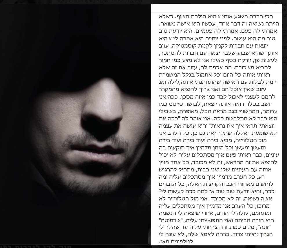 אתם מוזמנים לתת לייק לעמוד הפייסבוק החדש של העמותה, ולקרוא גם אתם את המונולוגים האישיים והמרתקים של הגברים האלימים, לשתף, ולתרום למודעות למאבק. הנה דוגמא לאחד הוידויים.